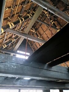 2階に上がると中の骨組みがよくわかります。職人が手作業で茅を屋根に並べる当時の作業の様子などが展示されていました。