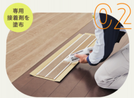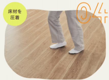 上から踏み込んでテープと床材を圧着します。
