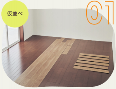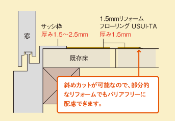 薄くて軽くて丈夫な、上から貼るだけの1.5mmリフォームフローリングUSUI-TA〔ウスイータ〕。上貼りなので音も粉塵も出ず、住みながらリフォームが可能。戸建住宅でもマンションでも活用できます。