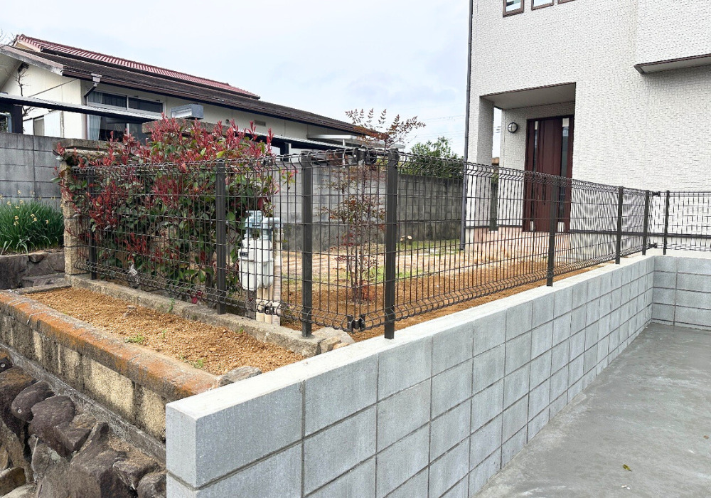 道路から玄関までの高低差があるため、コンクリートブロックを積み上げメッシュフェンスを施工しました。見栄えが良くなり、メッシュフェンスにすることでより視界が広がり綺麗に見えますね。