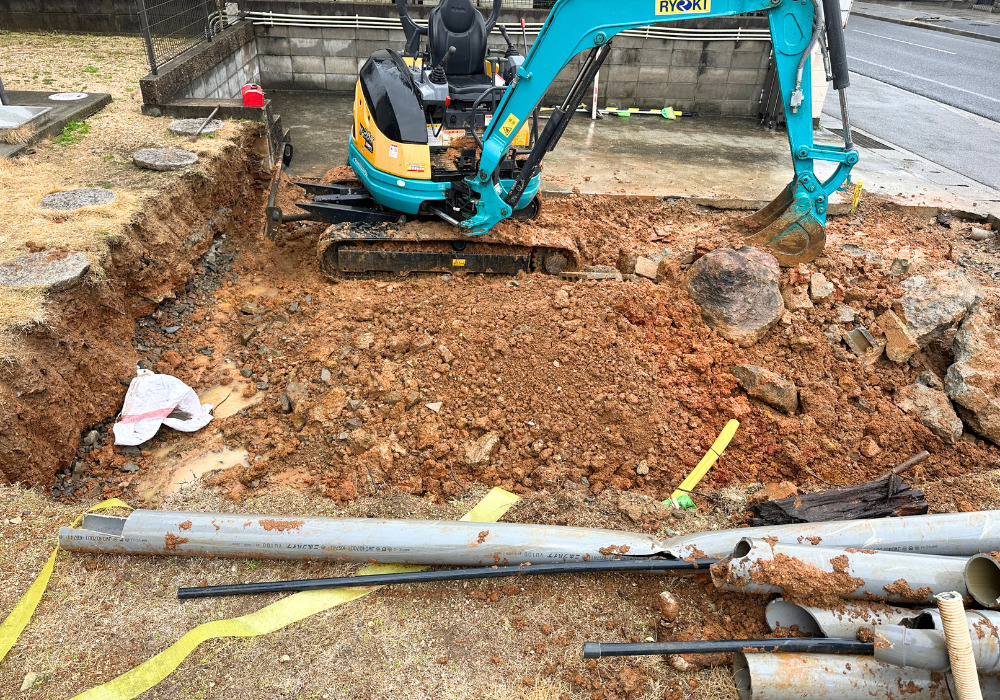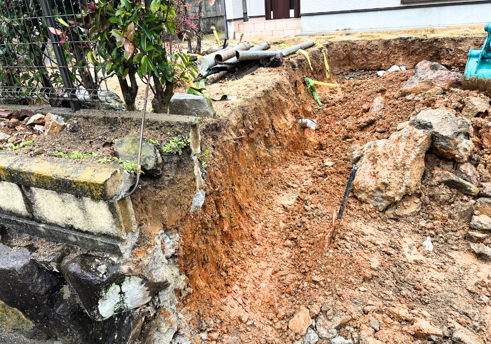 植木の根や石、必要なくなった古い配管などを丁寧に取り除き、形を整えていきます。