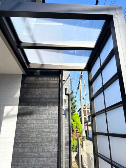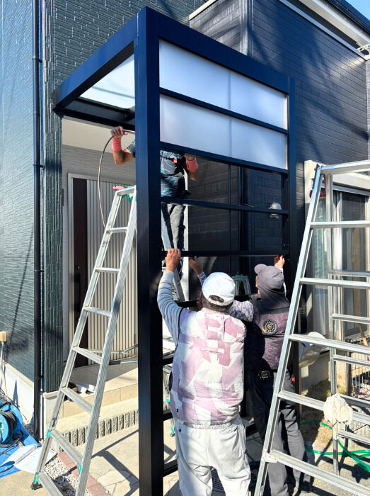 • 柱を立てパネルをはめ込んでいきます。施行は1日で完成するので、玄関前の工事でしたが、生活に支障なく施工できました。