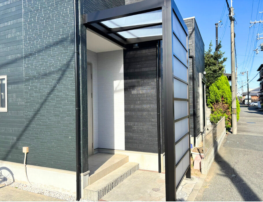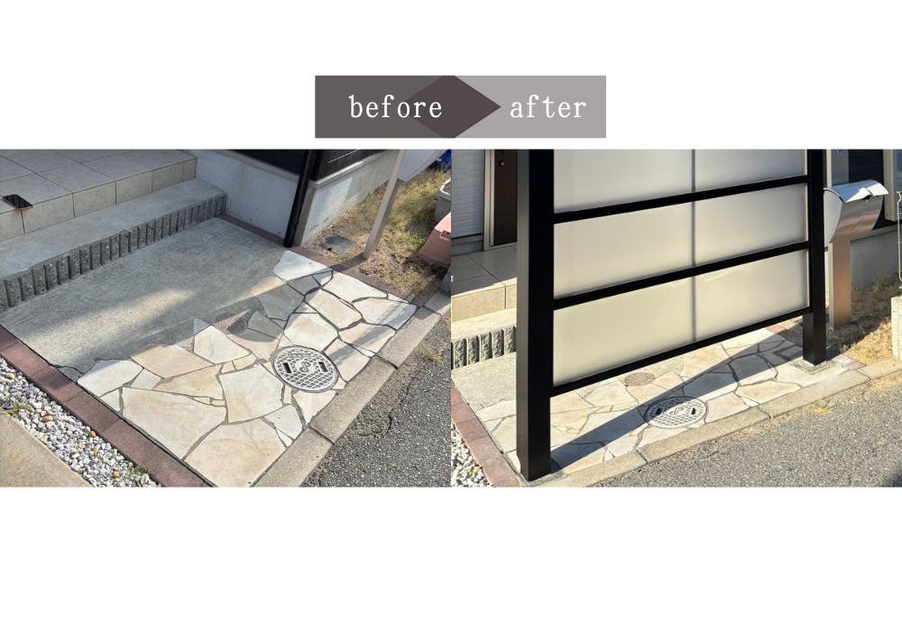 こちらのお家は目の前に海があり、雨風が強い時には玄関前に雨が吹き込み困っているとご相談がありました。採用した商品はLIXILの¨プラスGスクリーン横格子タイプ¨です。玄関前に設置すること雨風も防ぎながら目隠しにもなりおススメです。