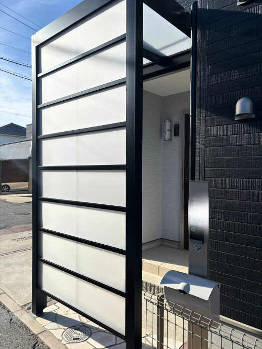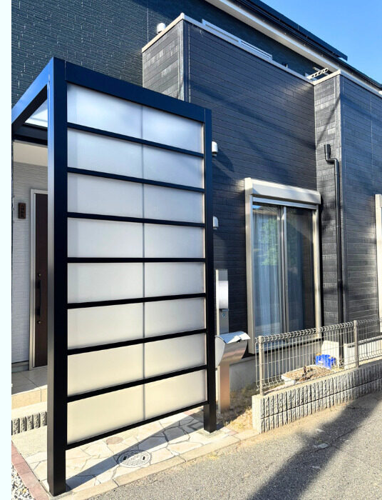 • Gスクリーンの完成です。お色も外壁にあわせてブラックに統一、パネルはクリアマットを採用したことにより、目隠しの役割もありながら圧迫感が出ずオシャレな仕上がりとなりました◎