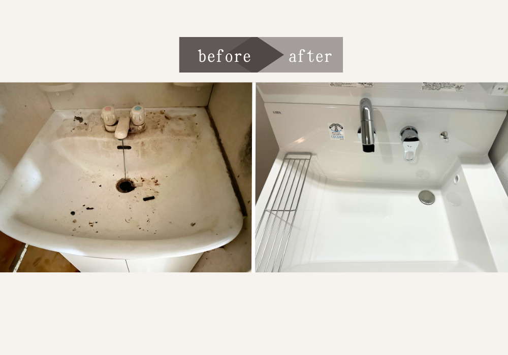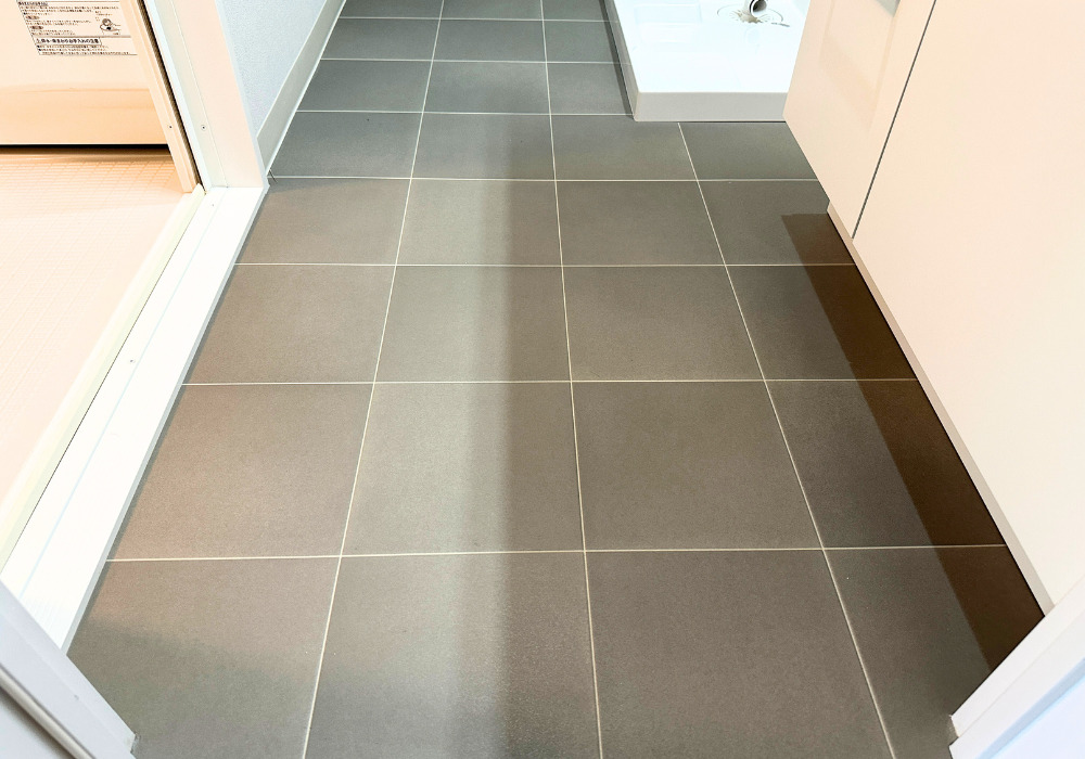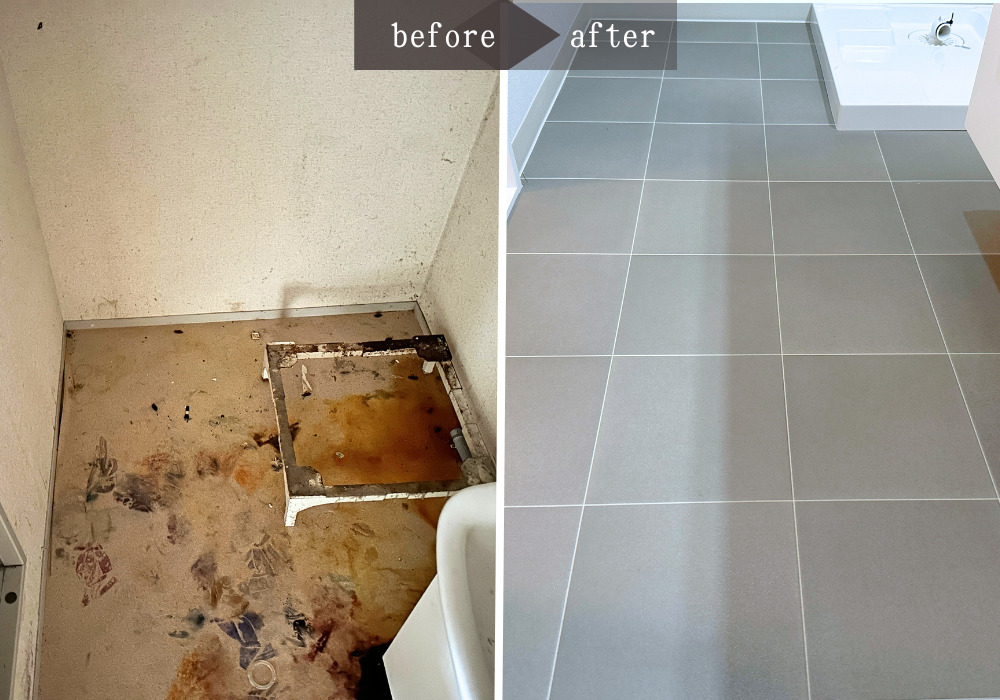 • 洗面所床(施工前後)                  洗面所の床施工前は汚れがひどく、床のクリーニングをしても厳しい状態でしたが、グレーのクッションフロアに。デザインもシンプルかつオシャレで、髪の毛やホコリなども目立ちにくく、洗面所にピッタリです。