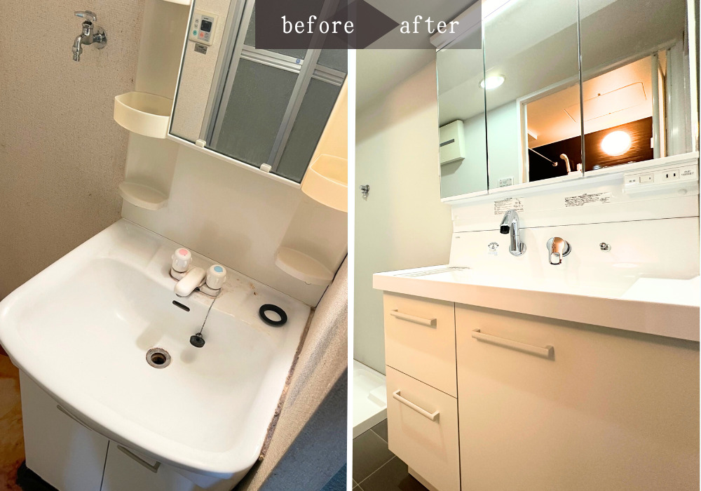 • 節湯水栓(施工前後)                  施行前の水栓は節水タイプではなく、2ハンドルの水栓で使い勝手もあまりよくありませんでした。節水タイプの水栓を付けることで補助金の申請も可能で、省エネ効果もあるので水道代も高くならず一石二鳥です。         ※補助金対象