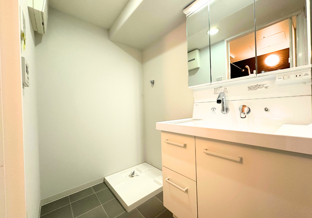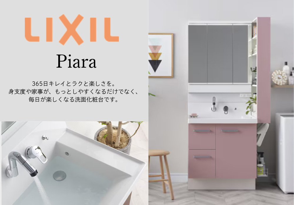 • LIXIL ピアラ                    ひろびろボウル&くるくる水栓なら2人使いや水汲みもしやすく、そして3面鏡のトレイアレンジは、トレイを5cm刻みで設置できるので高さの違うものを効率よく収納することができます。