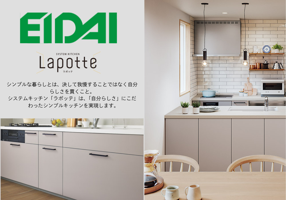 • 永大産業 ラポッテ                  こちらのキッチンは、シンプルなデザインで小さめの間取りのお家にピッタリです。コンパクトながらも収納力があり、お手入れもしやすくなっているため使い勝手重視の方におススメです。