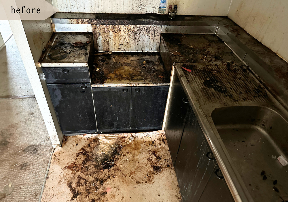 • キッチン(施工前)                   かなり汚れがひどい状態で、虫も住みやすい環境となっていました。生活には欠かせないキッチンを、使い勝手が良いものに変えていきます。