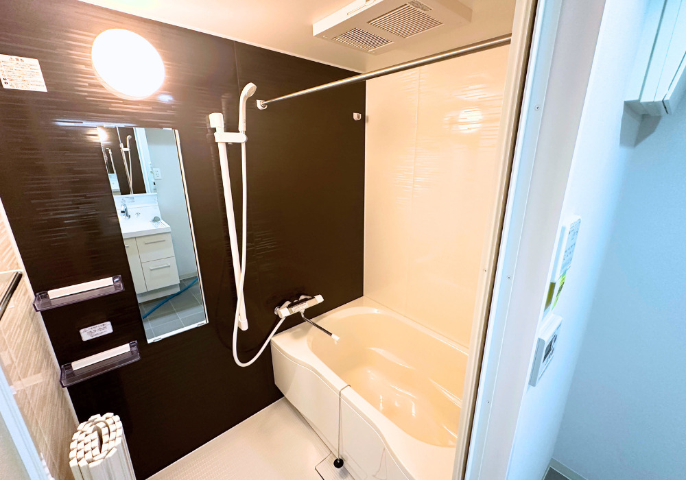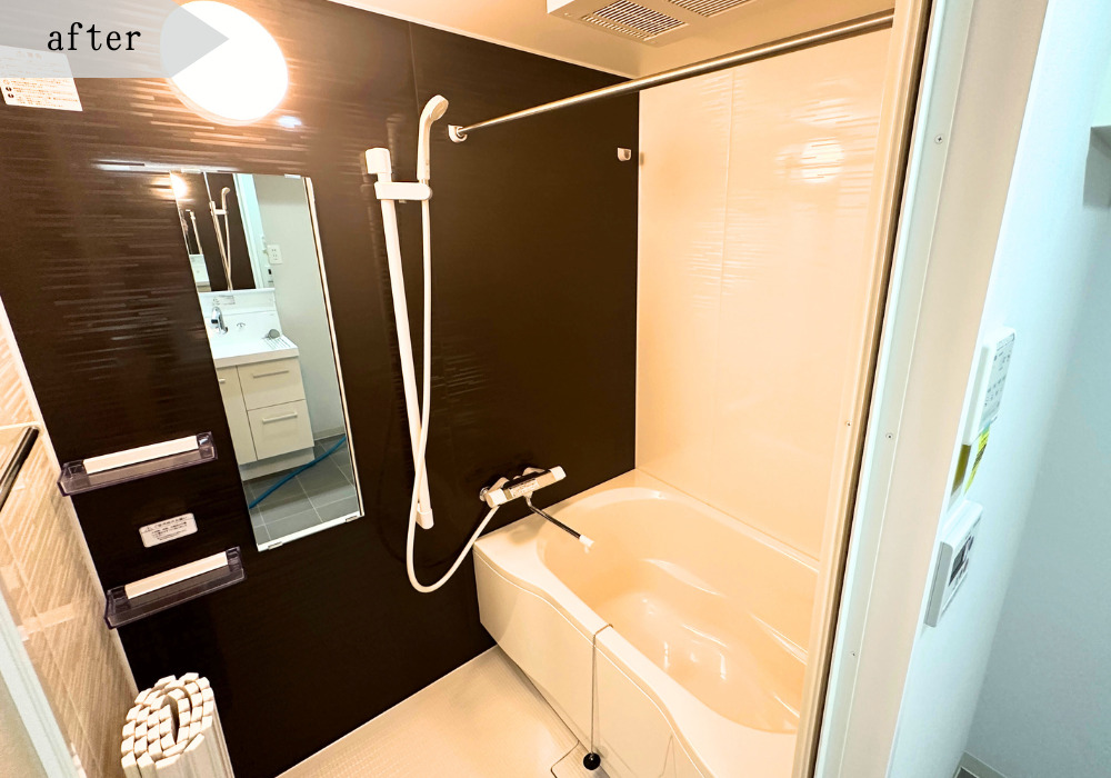 • お風呂(施工後)                    採用した商品は¨ハウステックのシステムバス1216サイズ¨です。費用を抑えたいとのことだったため、コストパフォーマンスの高いこちらを採用しました。浴室乾燥機も設置したので、雨の日の洗濯も困りません。          ※補助金対象