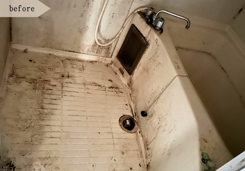 • お風呂(施工前)                    こちらもかなり汚れがひどいです。リラックスできる浴室にリフォームしていきます。