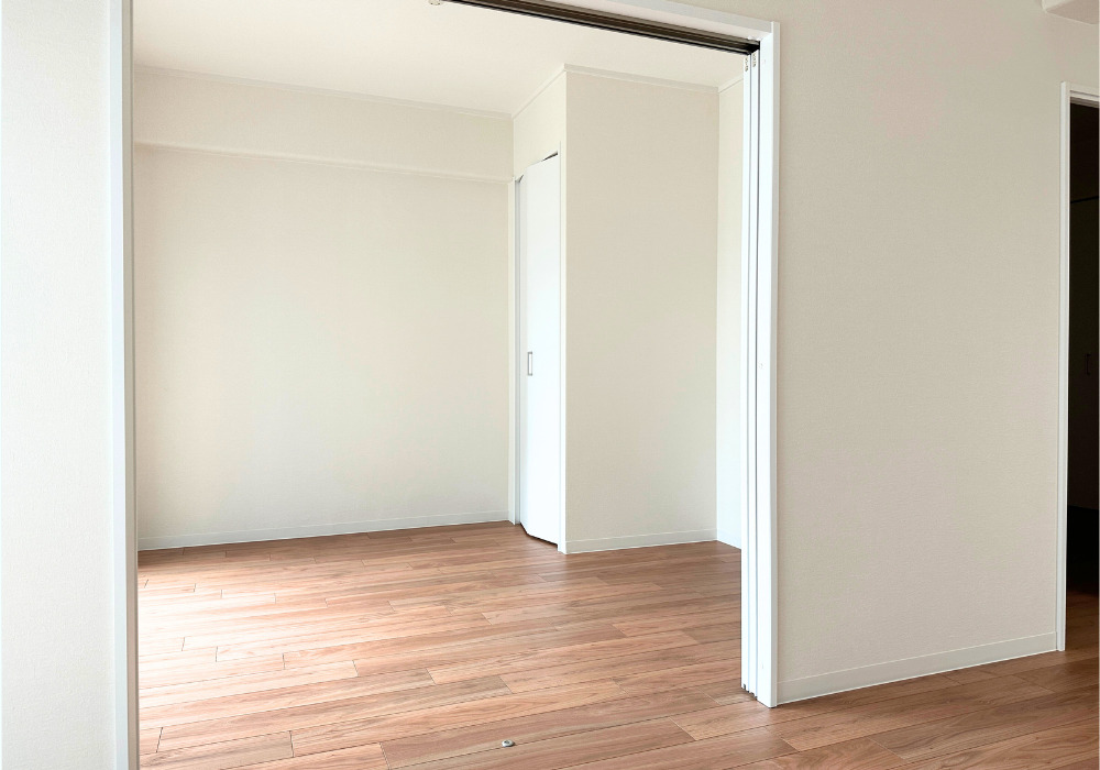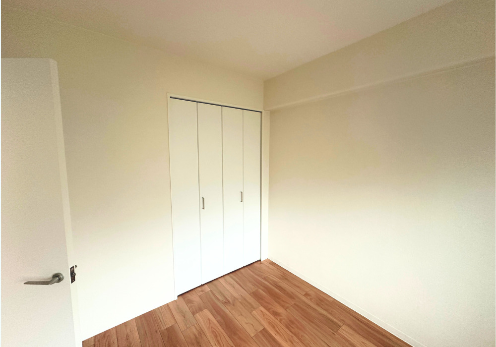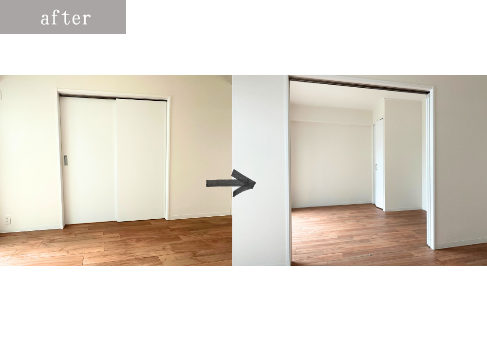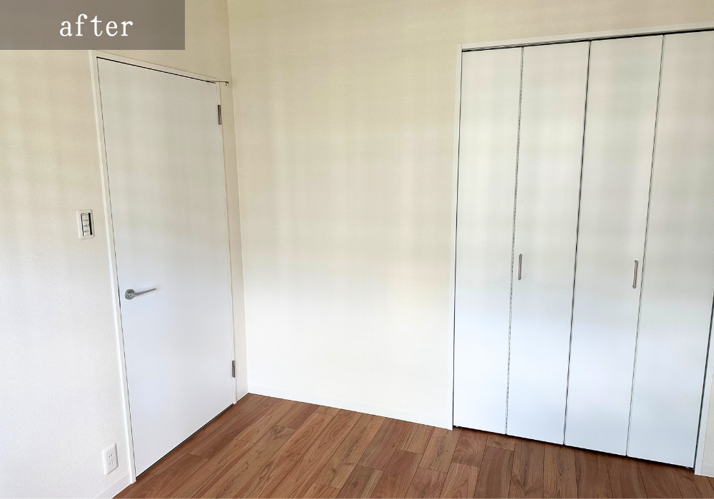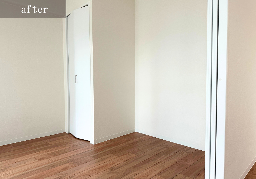 この部屋は、クローゼットを開き戸から折れ戸のものに変更、使い勝手が良くなりました。床もフローリングに、建具や壁も綺麗になりました。
