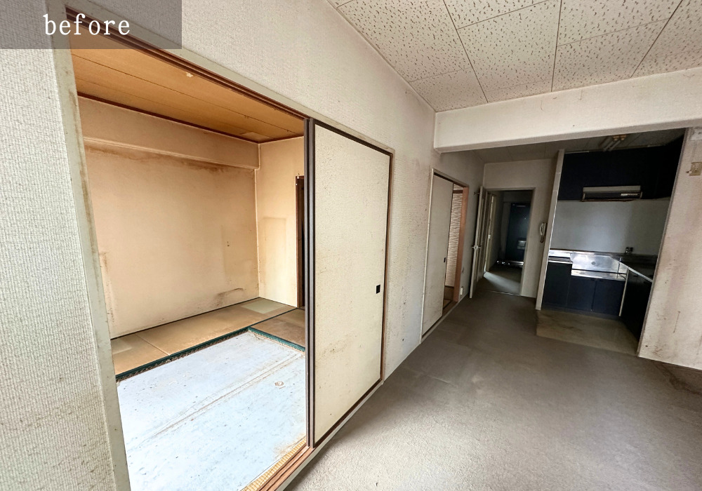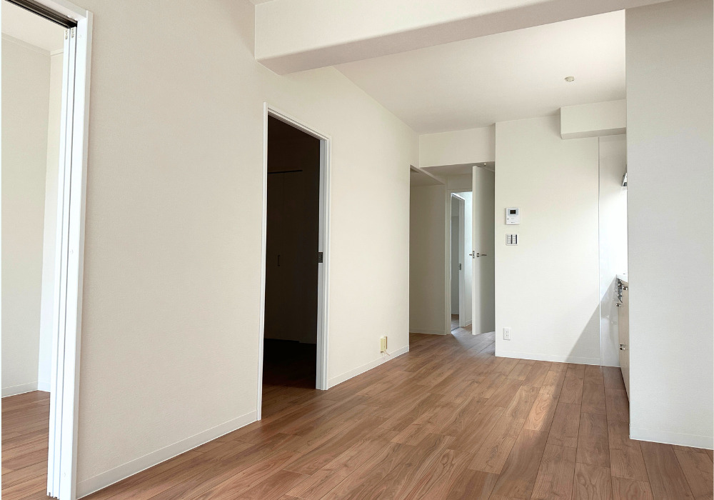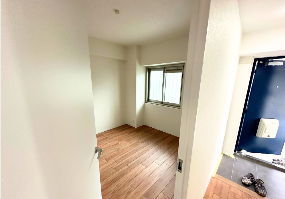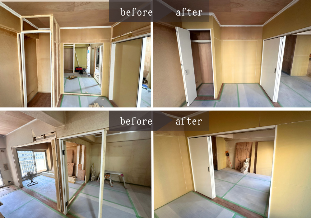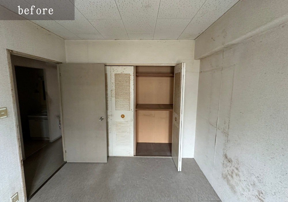 この部屋は、クローゼットを開き戸から折れ戸のものに変更、使い勝手が良くなりました。床もフローリングに、建具や壁も綺麗になりました。