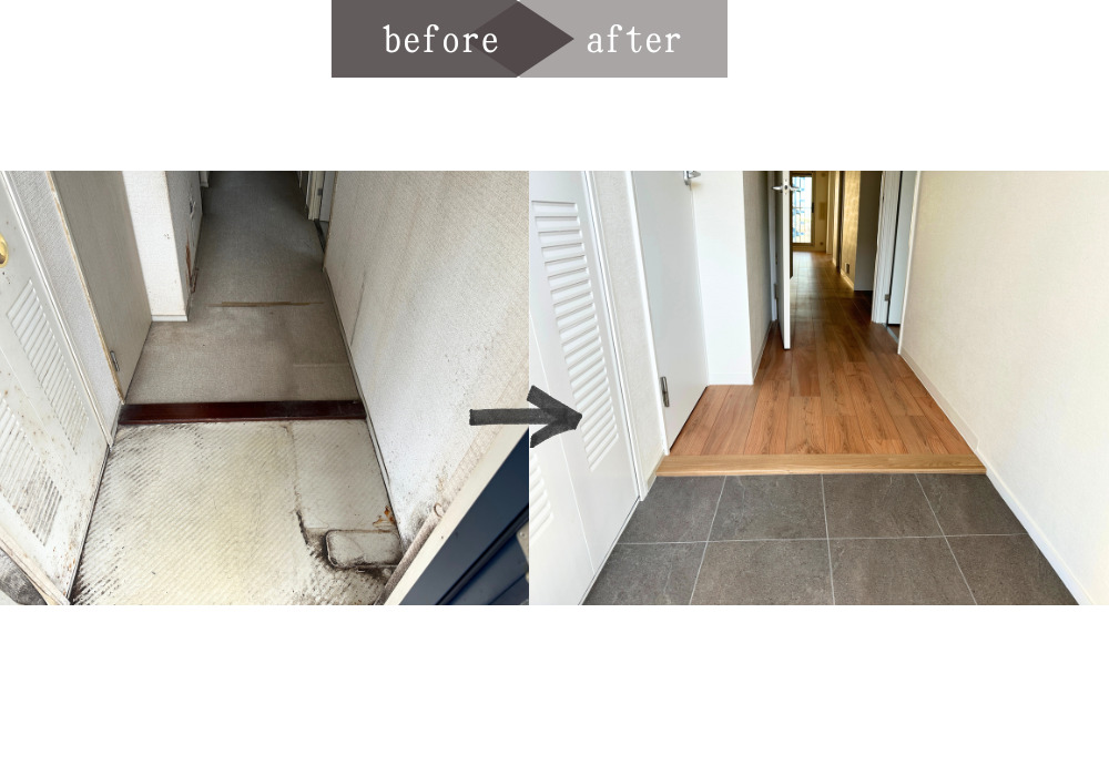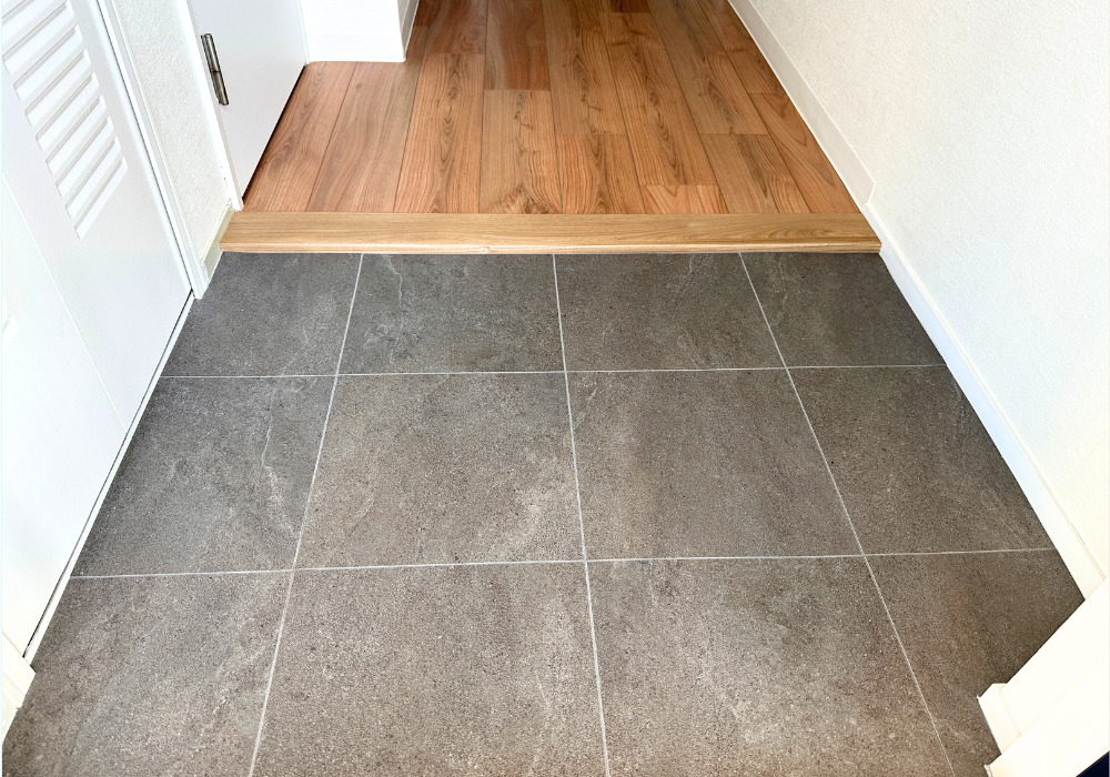玄関もフラットにするためにレベラーで高さを調整しました。フロアタイルの色も今風のデザインにしたことにより、オシャレな玄関になりました。