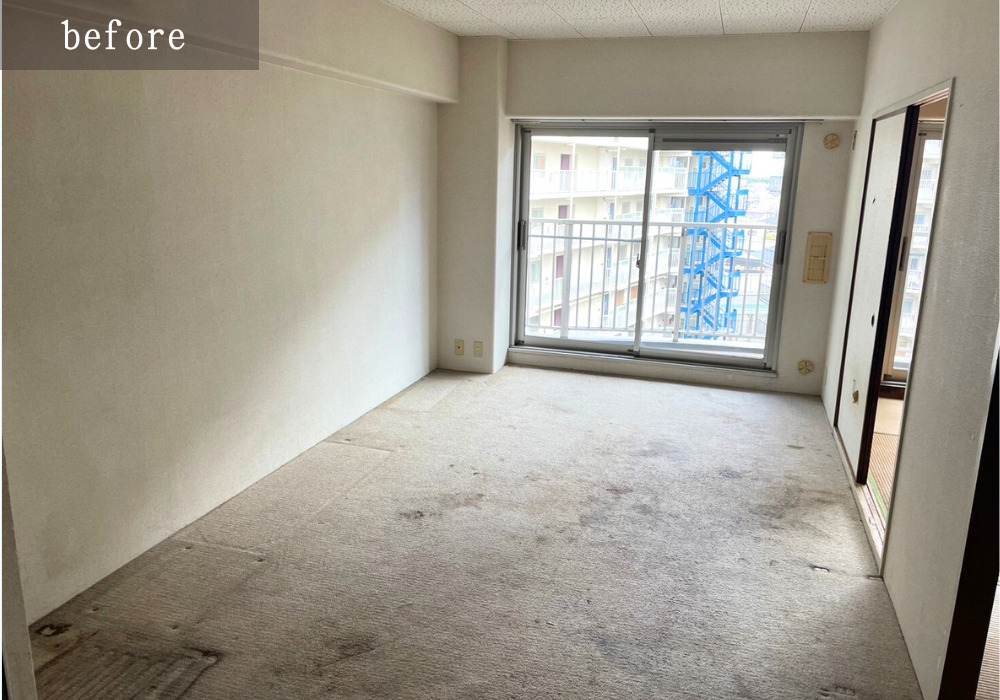 施行前のリビングです。床はカーペットでカビが生えており、クリーニングしても綺麗にならない状態で汚れがひどいので、アレルギーなどがあると大変ですね。完全に撤去してから施工に移ります。