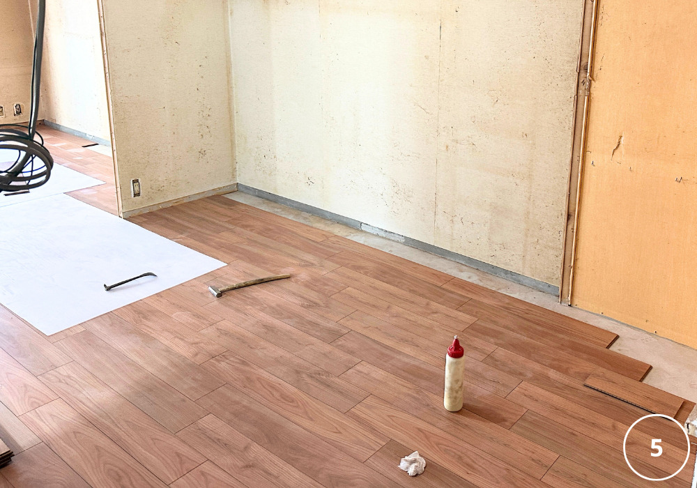 ⑤フローリングを丁寧に貼りつけています。今回採用したフローリングは【NODAメイボクデザインのンション用、防音床暖40・45】です。格調の高い化粧シートフロアです。