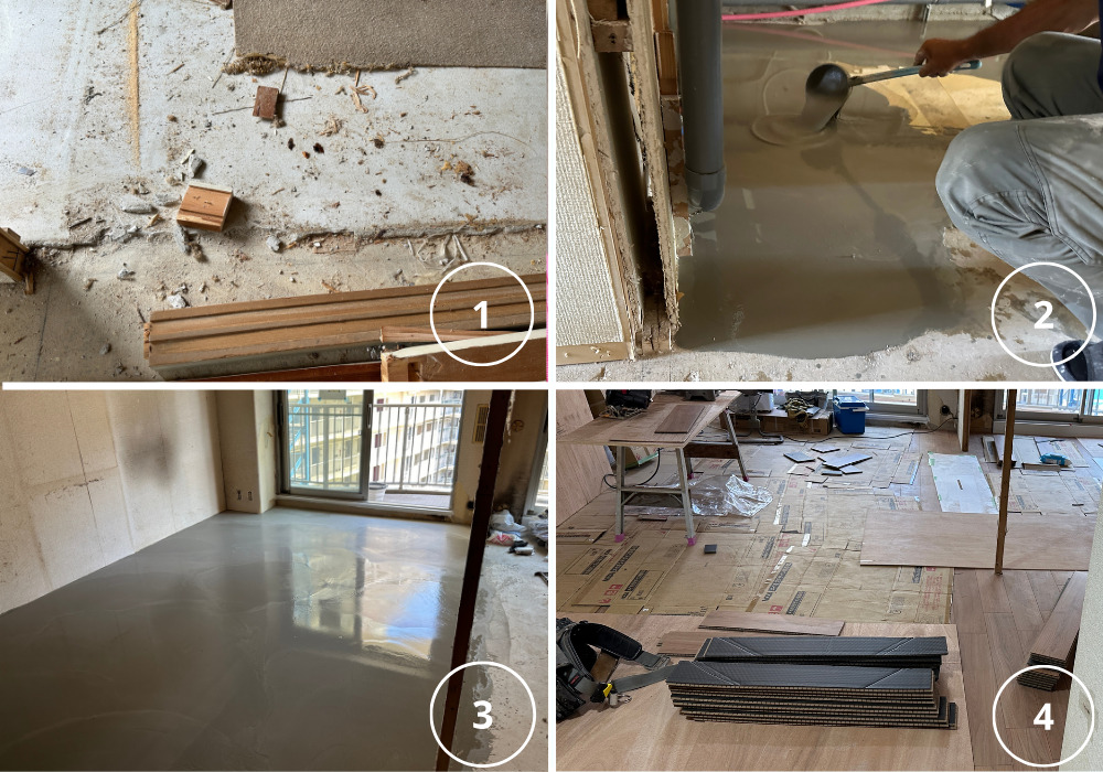 ①敷居などで高さがある場合、そのままフローリング貼ると建具などが取り付けできなくなる為、レベリングという作業を行っていきます。②レベラーという液体を基準の高さになるまで流し込み、床をフラットにしていきます。 ③綺麗に流しこめました。2時間程度で乾きます。④黒いものが遮音のクッションで、この上からフローリングを敷いっていきます。