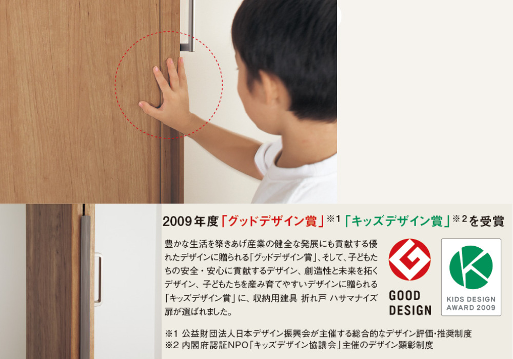 扉にすき間ができない設計の「ハサマナイズ機構」を採用することにより、よくあるお子さまの指はさみ事故を防ぎます。すき間に後付けできる「後付け保護カバー」もあります。