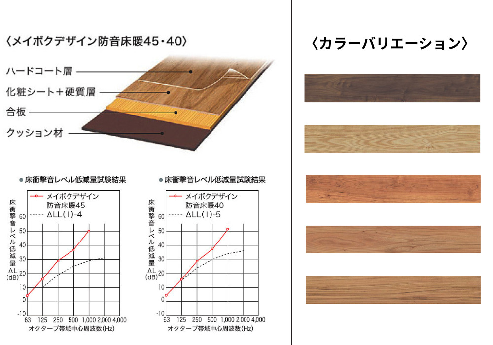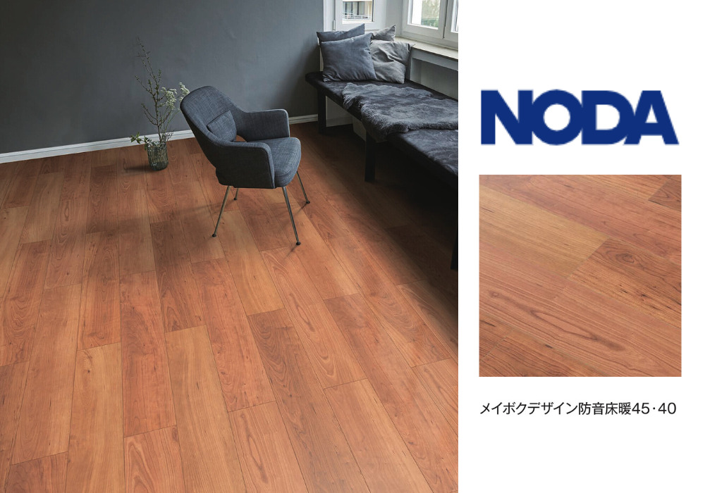 NODAメイボクデザイン防音床暖40・45の特徴は、①ワックス不要②汚れや傷に強い③抗菌対策④床暖や電気カーペットにも対応可能⑤防音です。小さなお子様がいるご家庭でも安心して使える商品となっています。