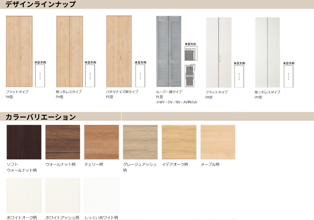 デザインやカラーバリエーションも豊富です。折れ戸だけでな、引き戸もあるので、用途や設置場所によって様々なタイプから選べるようになっています。