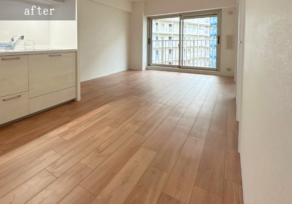 フローリングが綺麗になりました。下地を丁寧に整えたことにより段差もなく均一に施工できました。フローリングにすることで、ハウスダストなどのアレルギーも心配が減り、お掃除もしやすくなるため安心ですね。