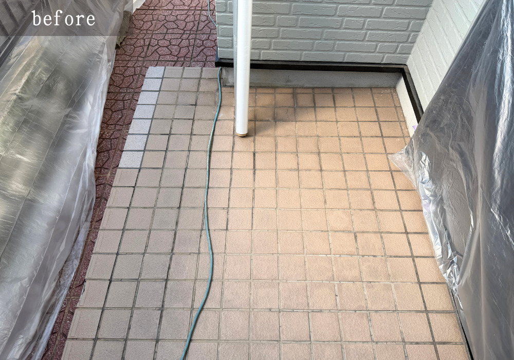 施工前の玄関ポーチです。ドア前部分の広さは十分にありますが、下段の部分が狭く奥のスペースにアクセスしにくい幅となっているため、幅を削ってスペースを確保する工事を行っていきます。