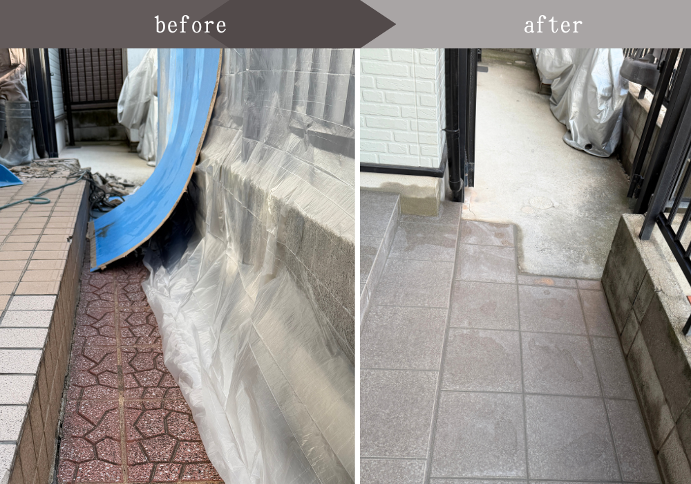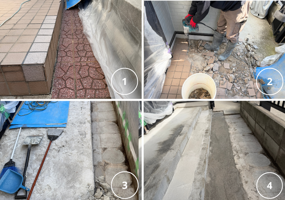 ①アプローチから境界塀までの幅が約40㎝程②既存タイルの撤去③タイル撤去後の下地が見えている状態④30㎝ほど削り、一番下の部分が広くなるようにします。新しい段差の下地も施工します。
