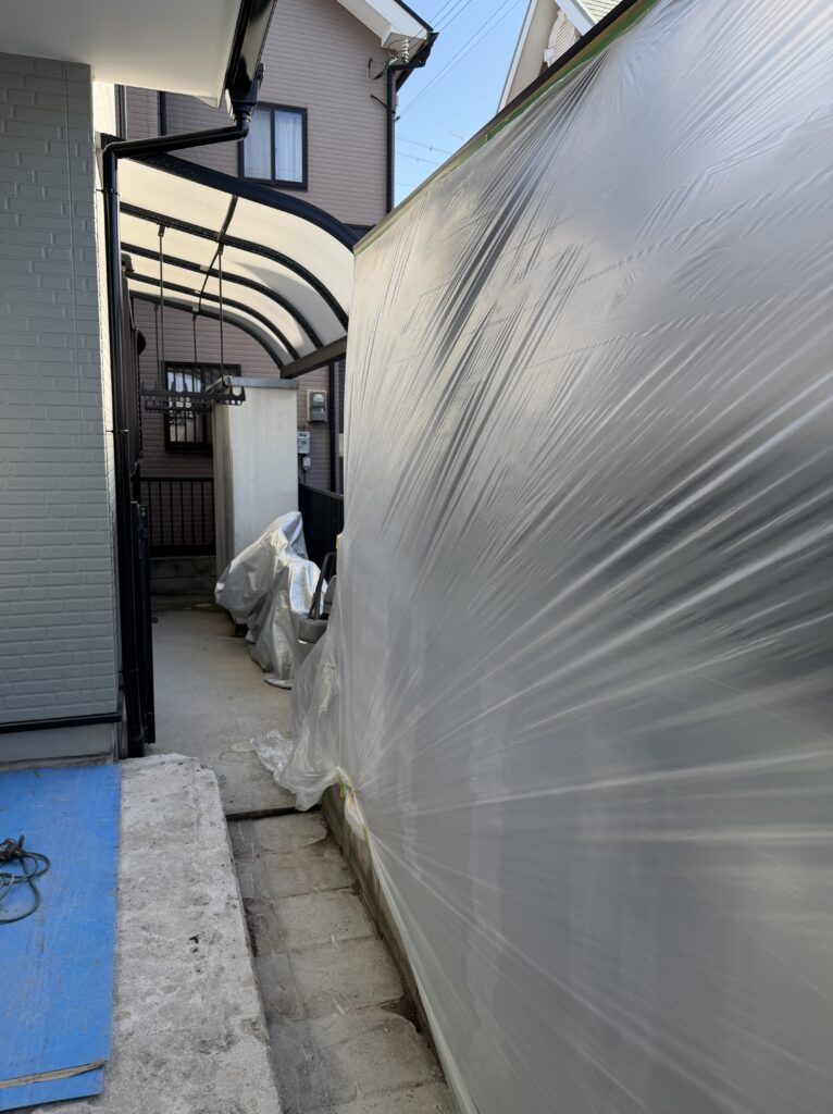 解体作業もある為、粉塵などで隣のお宅にご迷惑をおかけしないよう施工前に養生もしっかり行います。屋根下が玄関奥のスペースですが、自転車などを移動させるには狭いように感じます。