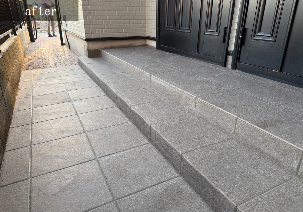 施工後 タイルを貼って完成です。アプローチ部分をポーチと同じタイルを貼ったことで、統一感もでて更に広く見えるようになりました。段差も低めの2段になっているため、つまずいたりする心配もありません。