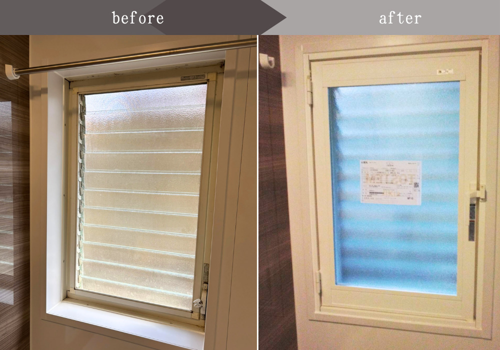 浴室 内窓 施工前後浴室に窓があると外気の影響をとても受けます。せっかく断熱浴槽にしても窓から寒い空気が入ってきてしまうため、内窓(インプラス)を設置しました。 ※補助金対象