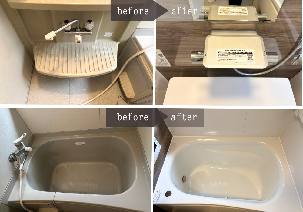 浴室節湯水栓/断熱浴槽 施工前後 水栓は省エネ効果のある節湯水栓に。浴槽は断熱効果のあるもので、採用した商品はサザナHTシリーズです。 ※補助金対象