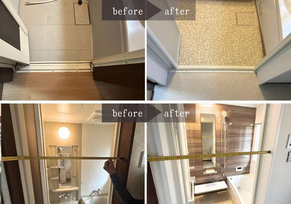 浴室出入口段差解消/幅拡張 施工前後バリアフリー改修をすることで、こちらの施行も補助金が出てお得に◎お掃除や出入りもしやすくなり一石二鳥です。 ※補助金対象