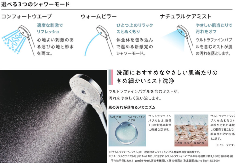 頭の真上からシャワーをたっぷり浴びられる「コンフォートシャワーバー(手すり兼用)」で、想像以上に爽快な浴び心地を体感できます。また、座って体を洗うときなど、好きな位置で自由に高さを固定でき、前出のアーチ形で手すりとしても使いやすいです。シャワーモードも3種類から選べます。