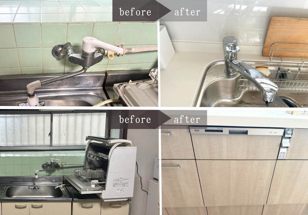 水栓/食洗器 施工前後キ ッチンの水栓を省エネ効果のある水栓に、シンク上に置かれていた食洗器はビルトインタイプになりました。 ※補助金対象