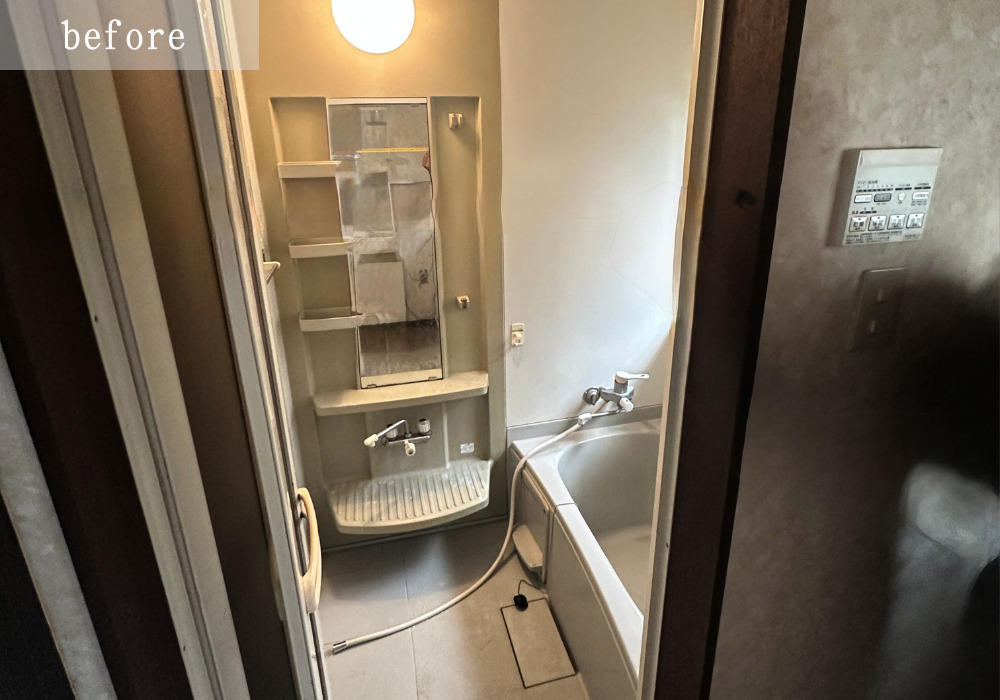 浴室 施工前 浴槽にお湯を張る際は蛇口を捻って出すタイプでした。窓もあり、冬場は更に冷えてしまうような浴槽でした。
