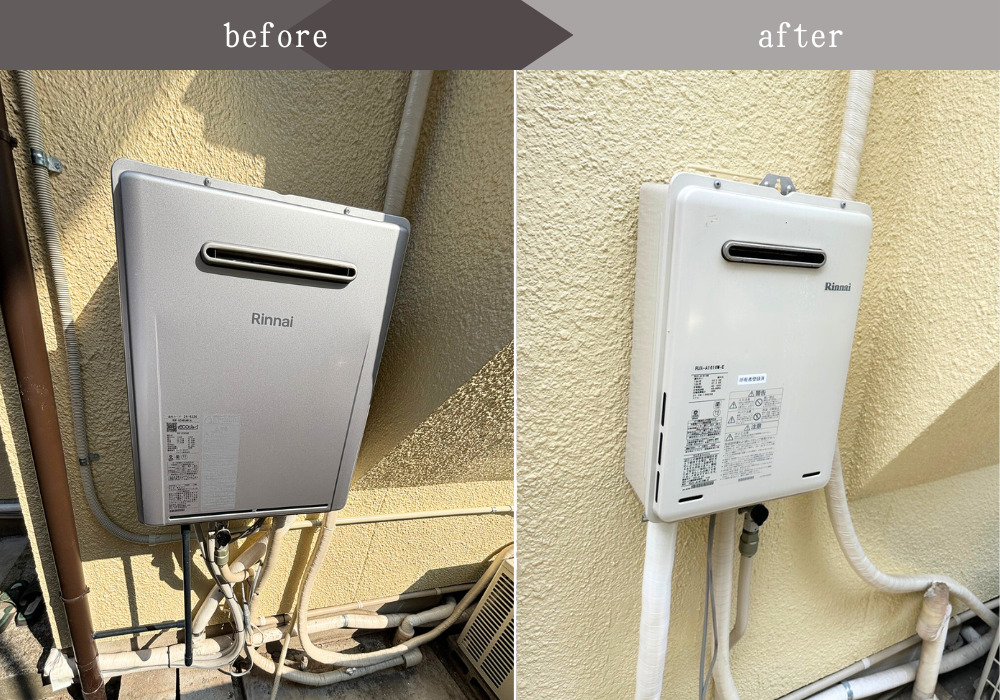 給湯器 施工前後 給湯器も経年劣化があったためこのタイミングで交換をしました。同じリンナイのエコジョーズです。 ※補助金対象
