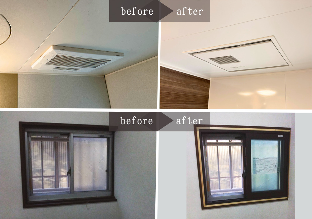 浴室乾燥機/洗面所内窓 施工前後 浴室乾燥機を新しいものに交換し、洗面所の窓にも内窓(インプラス)を設置しました。 ※補助金対象