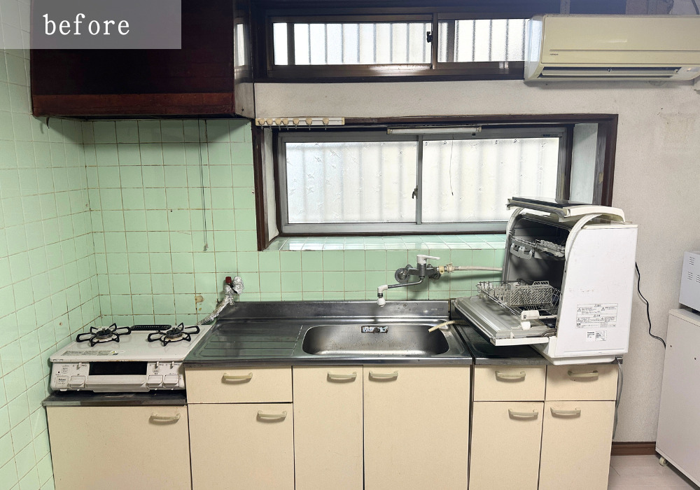 キッチンの施工前です。食洗機がシンク上にあることでスペースが大幅にとられてしまっています。ガスコンロ周りも掃除しにくく、全体的に使い勝手が悪くなってしまっていました