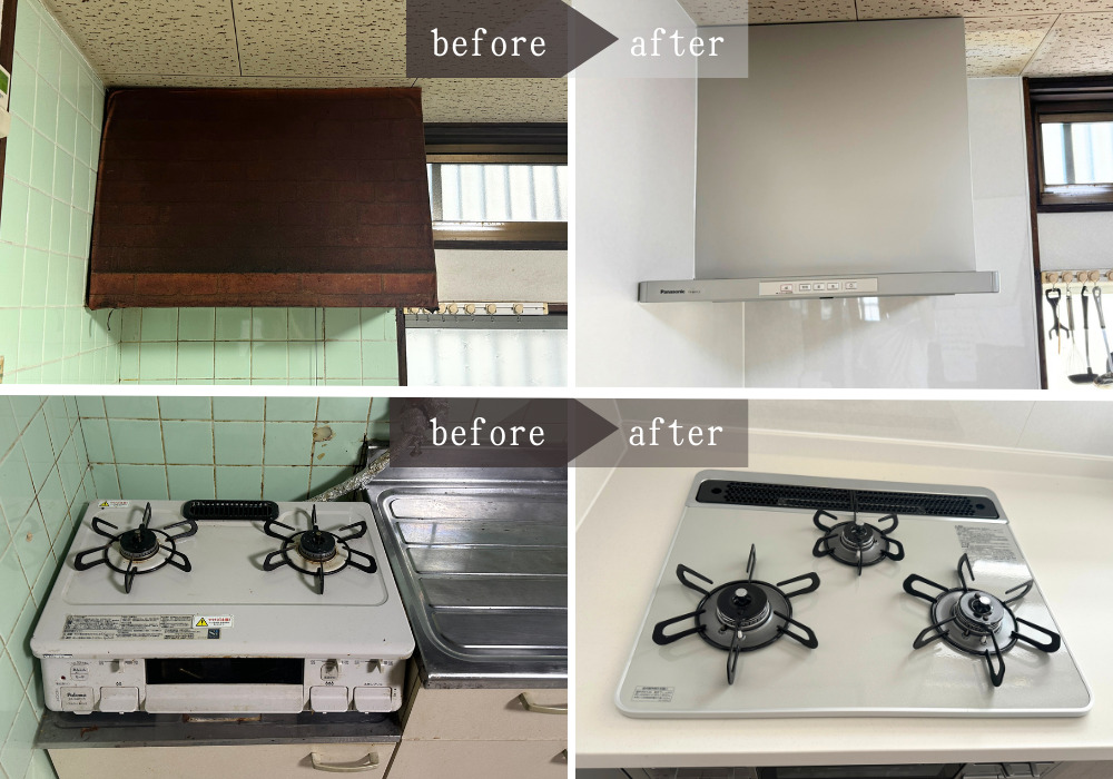 レンジフード/コンロ 施工前後 どちらもお手入れがしやすくなりました。 ※補助金対象