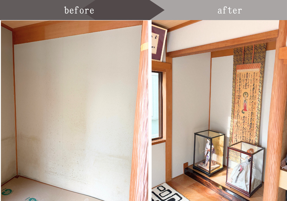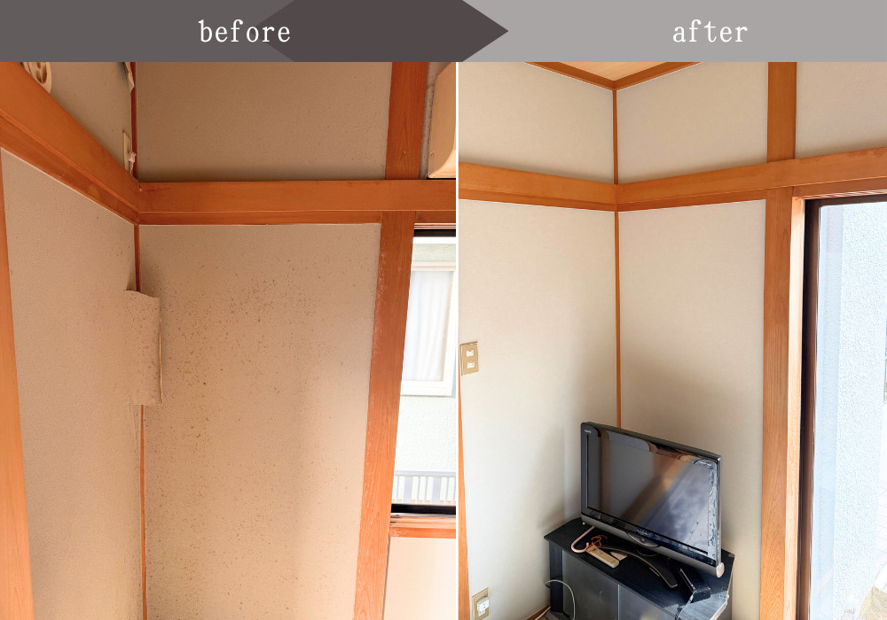 クロス張り替え 施工前後 カビやホコリによる変色があったため壁紙の張り替えを行いました。