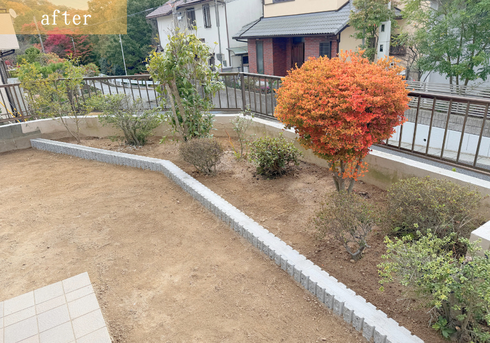 施工後 境界にブロックを並べることで植栽スペースがはっきりと映え、ブロック1段分の高さなのでより広く見えます。中からも外からも綺麗な景観になるよう植栽も並べました。