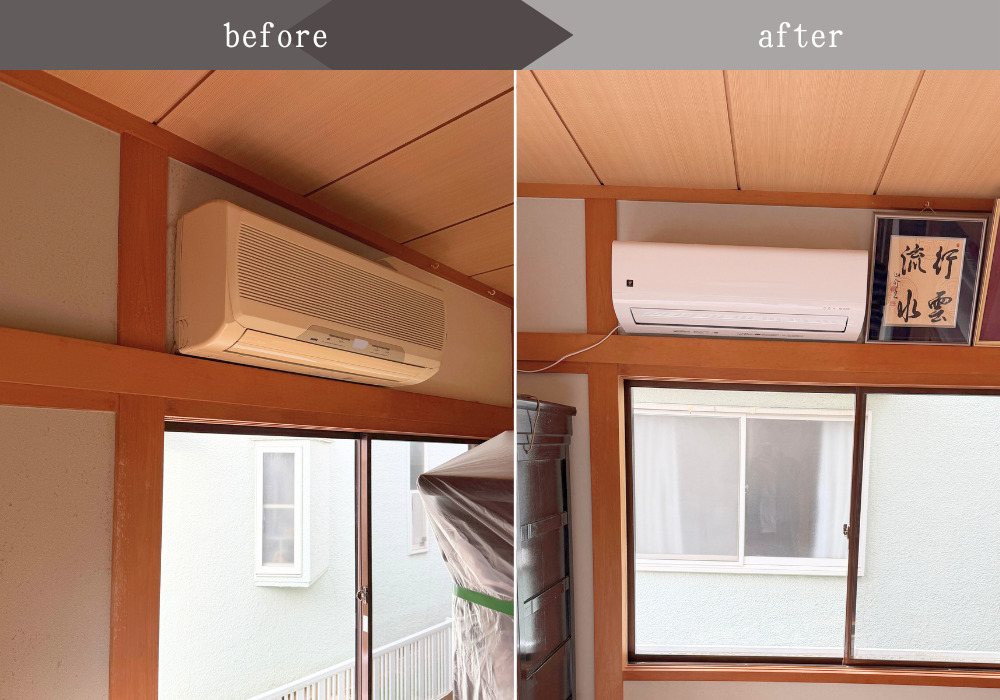 エアコン入れ替え 施工前後 古く効きが悪くなっていたため、新しいものに入替えました。劣化すると電力をたくさん使ってしまい光熱費が上がってしまうので、年数が経っていたら入替えをお勧めします◎