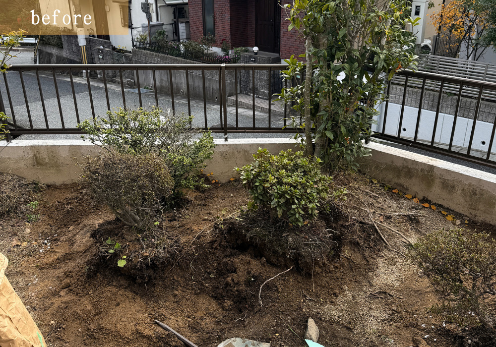 施工前 植栽スペース施行前は根っこが張ったりして、お手入れもしにくい状態となっていました。