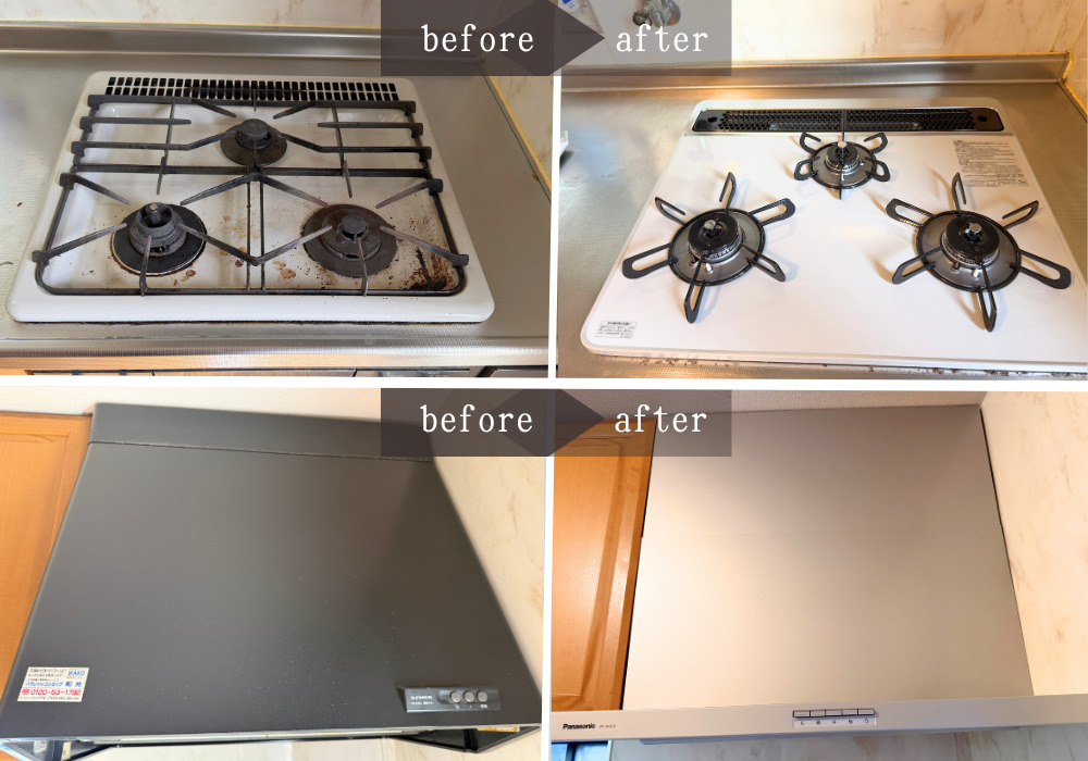 • キッチン施工前後                  コンロとレンジフードは補助金が使用できお得に交換することができました。                  ※補助金対象