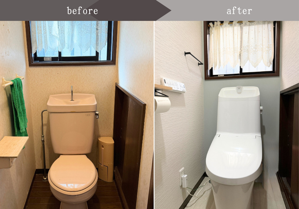 • トイレ施工前後                   トイレは¨LIXILのアメージュシャワートイレ¨です。背面のアクセントクロスは¨サンゲツSPの9791¨、フロアは¨SINCOLのE1010¨です。                     ※トイレ補助金対象