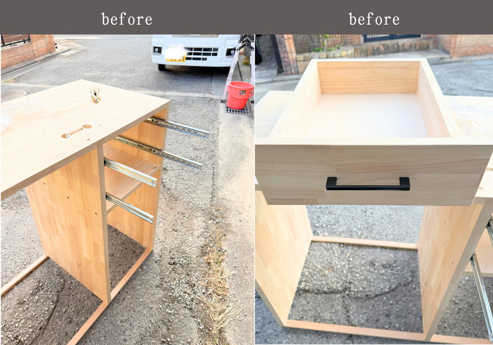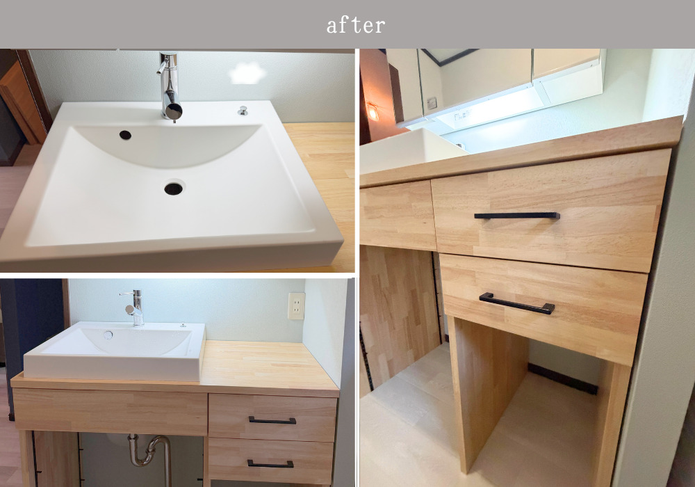 • 造作洗面台 施工後                 洗面ボウルは¨カクダイ¨のベッセル(置き型)タイプ。右下部分はタオルや小物等しまえる引き出しを作りました。上はタオルを畳んだり化粧品を置いたりできるスペースもあり、とても便利です。