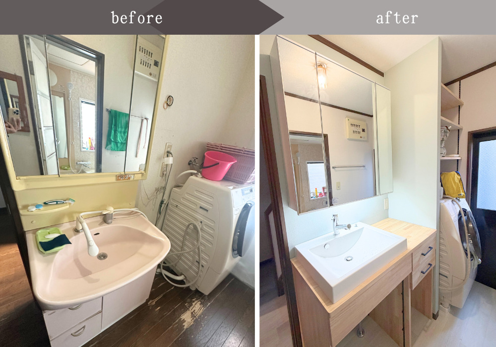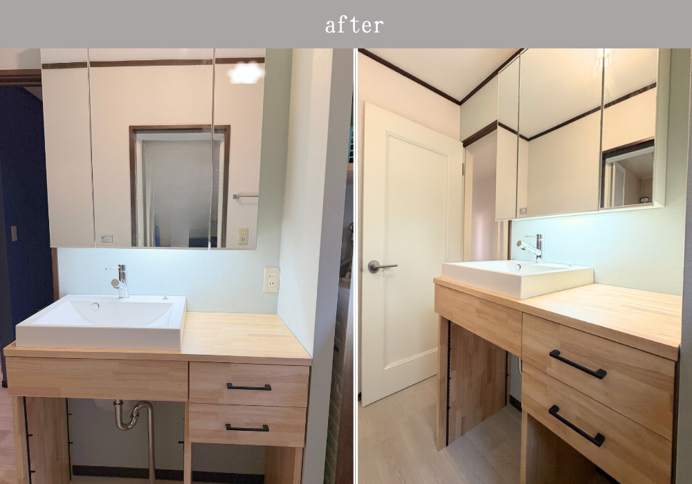 <お問合せ内容>お家が全体的に古くなってきているので①外構②内装③水回り④内窓の施行をさせていただきました。今回は水回りの施行事例をご紹介させていただきます。洗面台は既製品を使用するのではなくお客様好みのものを造作させていただき、使いやすさもオシャレも叶いました。