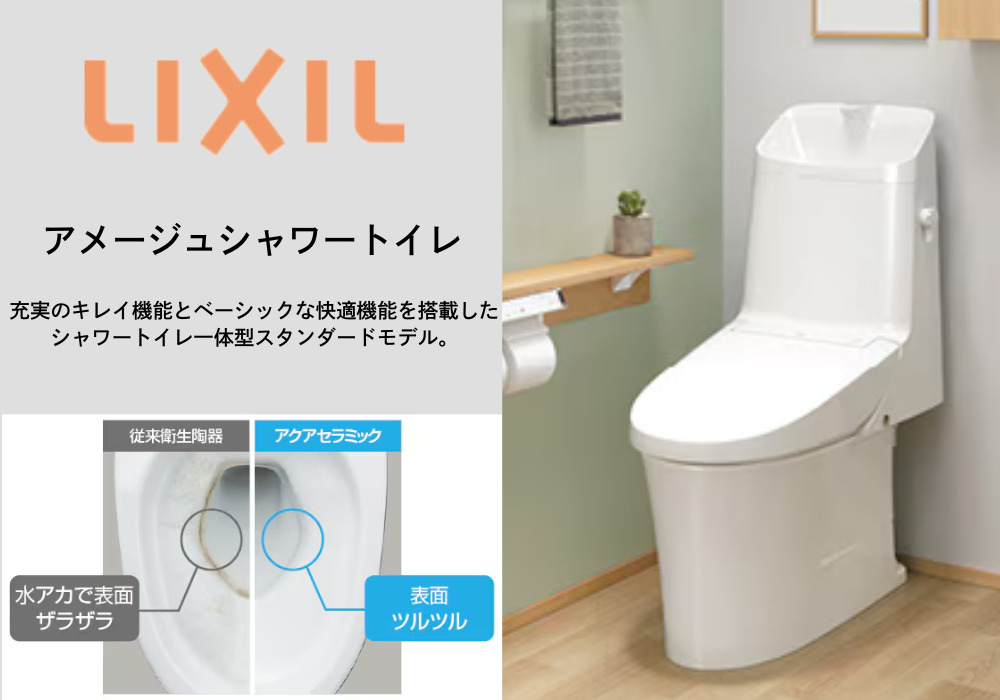 • トイレ 【LIXILアメージュシャワートイレ】        ●アクアセラミック                  水となじみやすいアクアセラミックは、便器洗浄やお掃除するたびに汚物を浮かせて洗い流すので、お掃除ラクラクです。                     衛生陶器表面に水酸基が出ない構造とすることで、水アカの固着を化学的に防ぎ、日頃のお手入れで水アカを落とし、いつでもキレイを保てます。