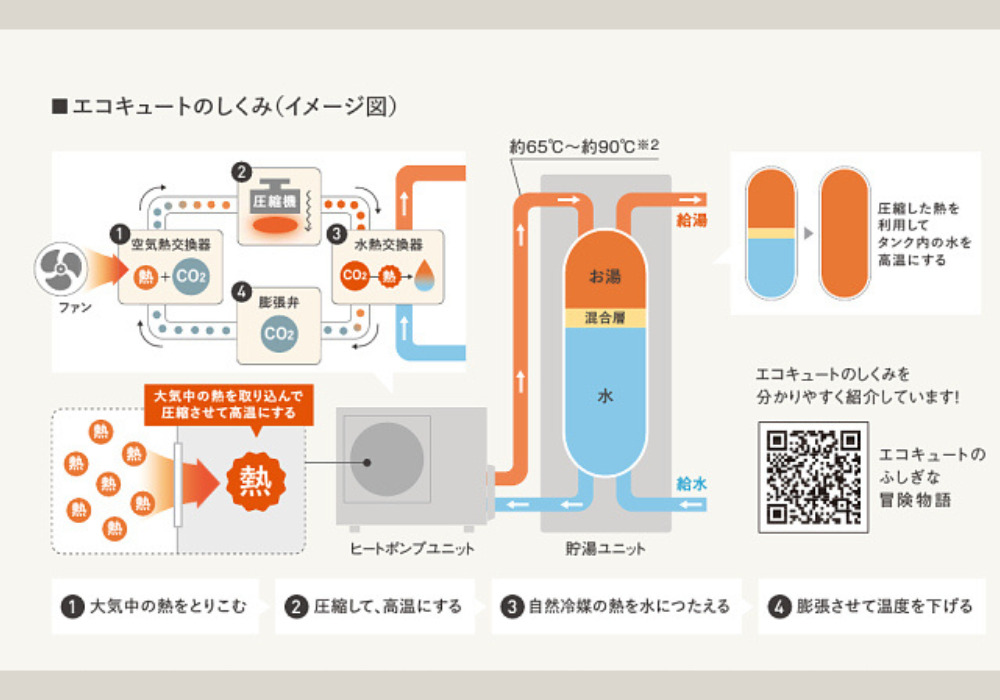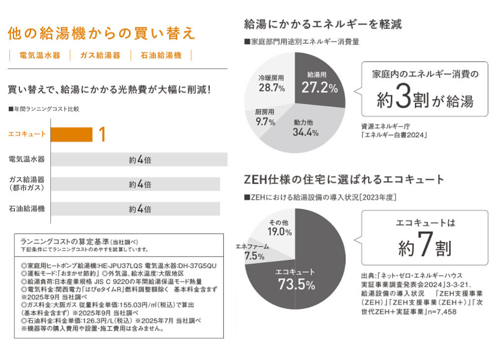 ■買い替えで給湯にかかる光熱費を大幅に削減 家で使うエネルギーの約1/3が給湯機に使われています。この給湯エネルギーを少しでも減らすことが省エネと環境対策のポイントになります。環境に配慮した「ZEH住宅」や、さらに省エネ性能の高い「GX志向型住宅」の実現に向けた切り札としてエコキュートが注目されています。