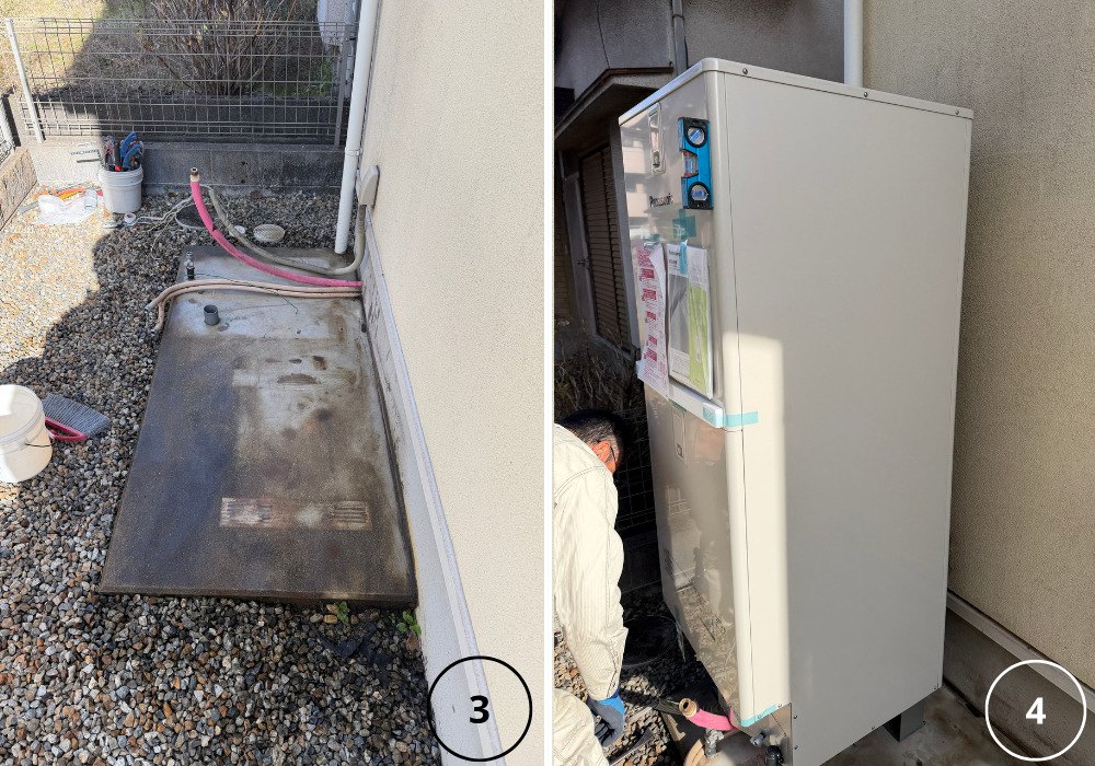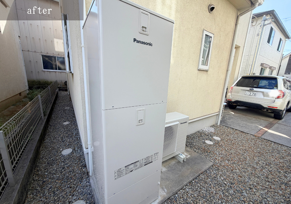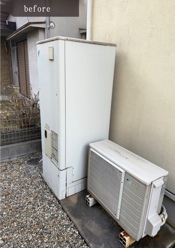 施行中 撤去作業が終われば新しいエコキュートの据え付け工事に取り掛かります。交換後のエコキュートのサイズに大きな違いがなければ、設置場所の変更や基礎工事の追加も必要ないため1日で施工が完了します◎
